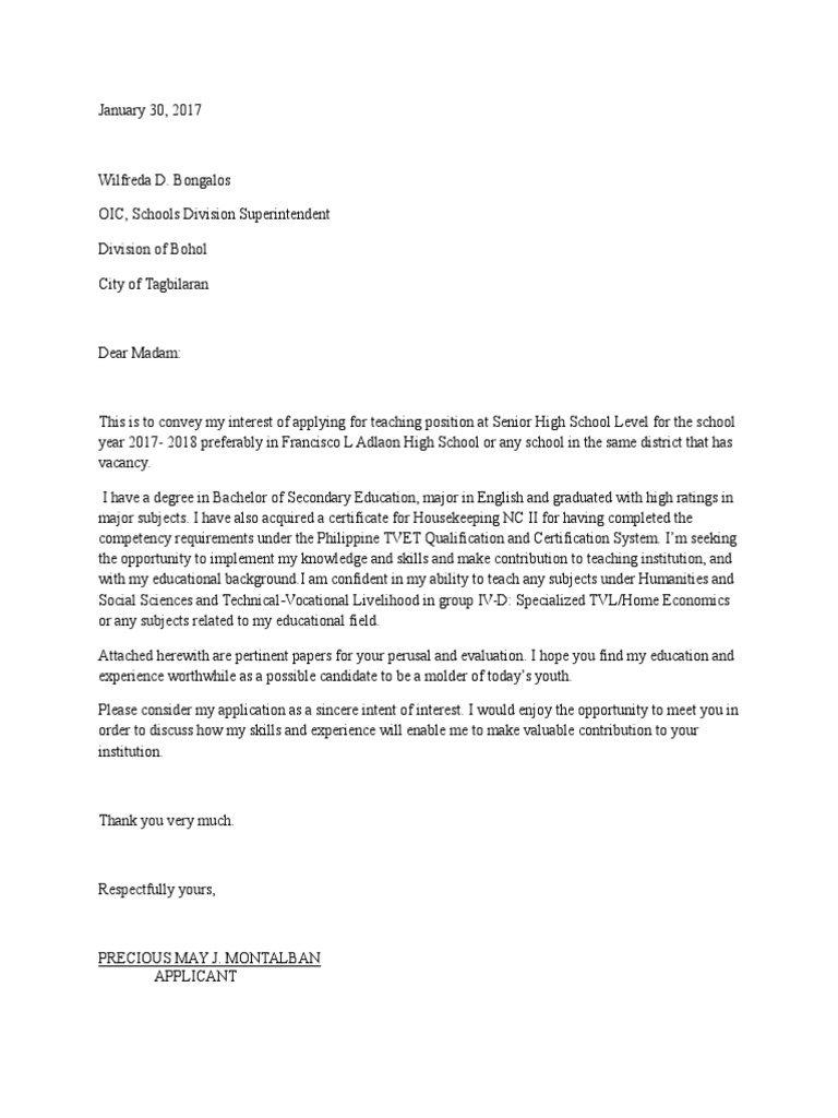 In general, a letter of recommendation for a teacher is written by the headmaster of his or her previous institute. Provide your contact information, and state that you are looking forward to hearing from them soon. The below sample of application letters for the post of a teacher will serve as a template for writing your own application letter or cover letter for teaching position in any school. If there's no prior working experience, then by his or her former professor. You have to define yourself in writing such that you will standout in presentation of your writing a cover letter for a position of a teacher is the task that should be well thought. Magdaong, mais principal samal thank you for taking the time to review my application. Sample application letter for secondary teacher (deped). Letter of intent (aka cover letter). Having some years of teaching experience can help boost your confidence level, but what truly matters is as a teacher, my main goal is for motivate students to do their best deped order for them letter reach their full potential. Sample application letter for teachers. The letter should be precise and highlight the positive traits of the applicant and how he or she is suitable for the given. Sample application letter for teachers. These various teacher application letters' selections include individuals focusing on elementary education, special education, substitute below you will find excerpts from the various sections that make up the sample application letters for teacher positions: